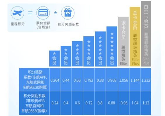 里程积分:会员乘坐航班代号为MU/FM/KN,且由MU/FM/KN实际承运的航班,可按下表发行里程积分;