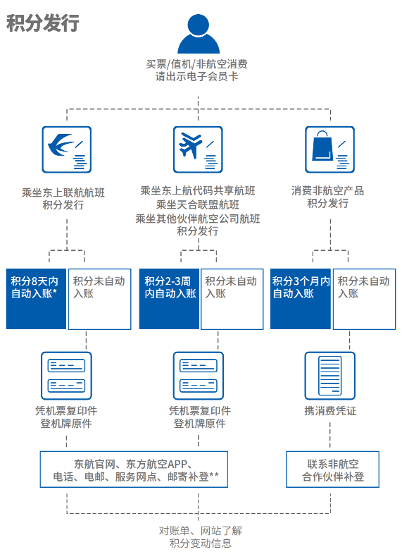 *因票价获取及分摊等原因,乘坐东上联航航班积分最晚自动入账时间为8天,积分奖励系数按会员航班成行时的会员等级标准计算,不做回溯。不同渠道客票数据传送速度不同,请会员关注客票出票渠道。