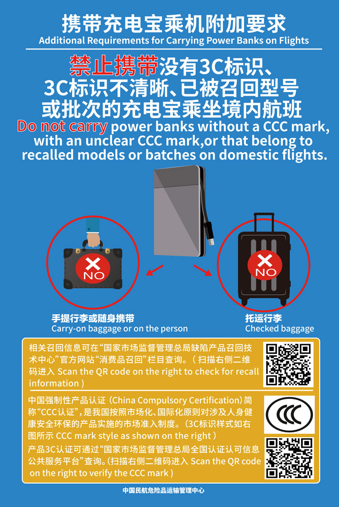 根据民航局相关规定,自2025年6月28日起,禁止旅客携带没有3C标识、3C标识不清晰、已被召回型号或者批次的充电宝乘坐境内航班。