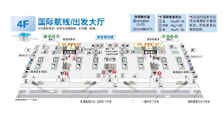 国际出发厅35-37号柜台:为国际航班经济舱旅客及普通会员办理值机、托运。