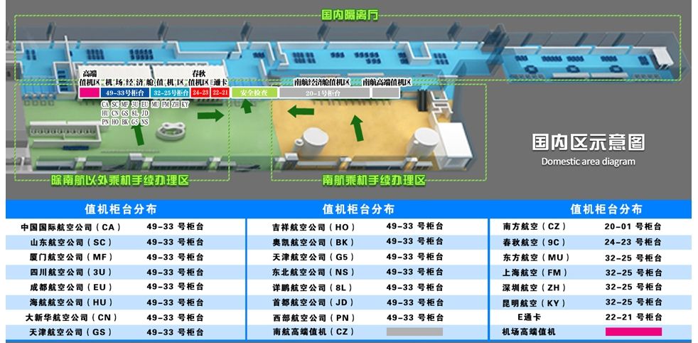 国内出发厅25-32号值机柜台:为国内航班经济舱旅客及普通会员办理值机、托运。