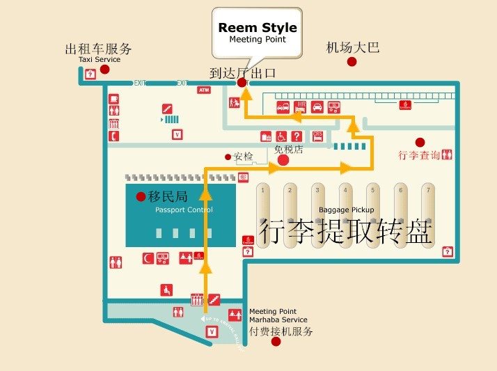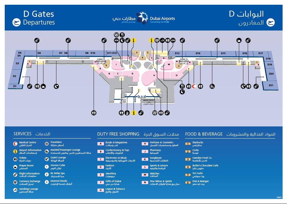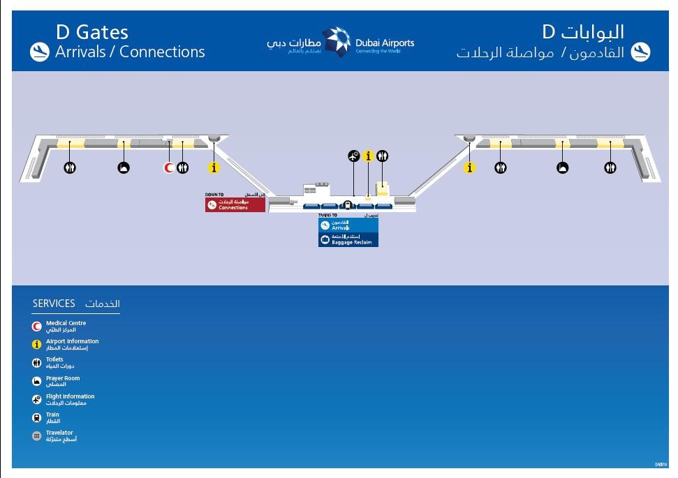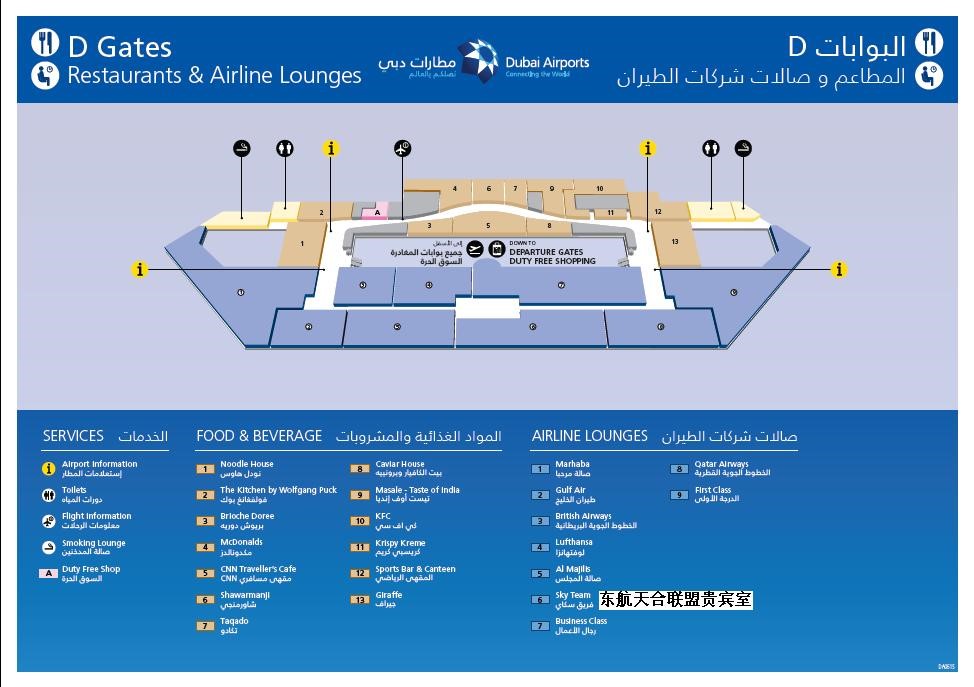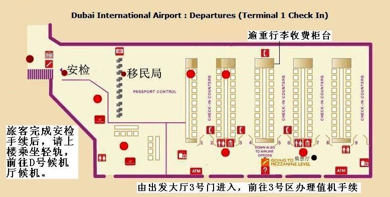 迪拜机场在到达层设有中转柜台位于D号候机大厅免税店对面。