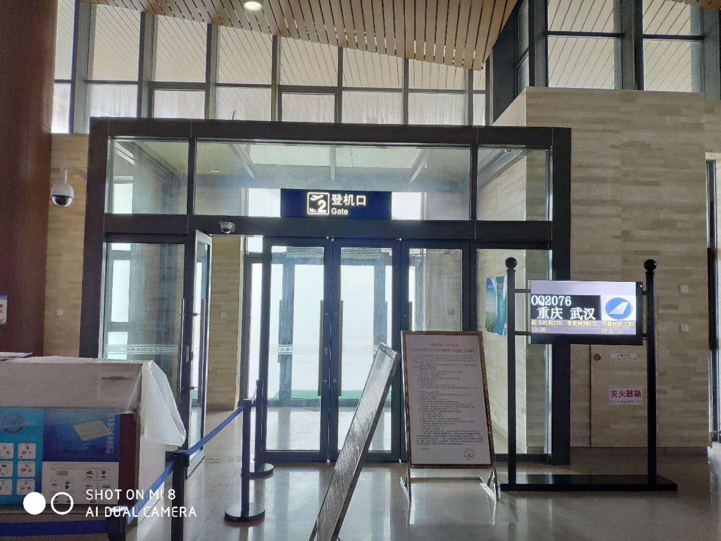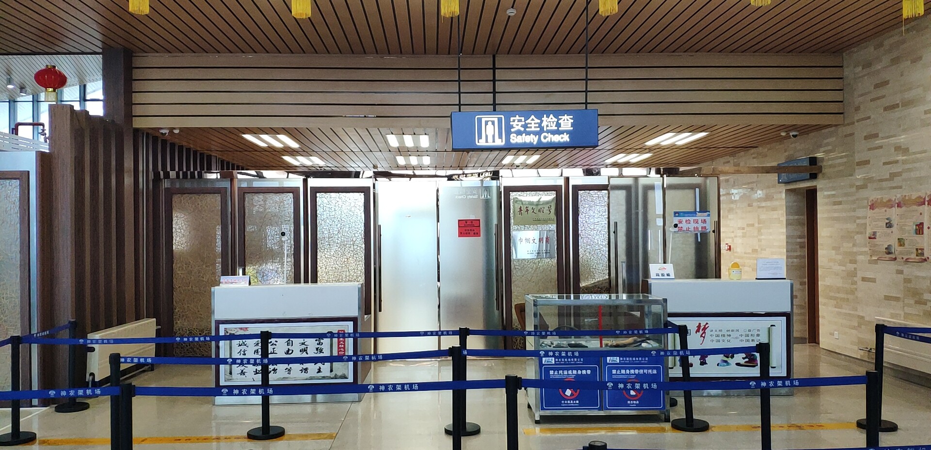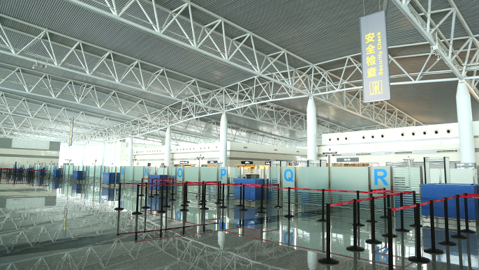 国内出发厅设有2条安检通道,其中1条为员工通道,1条为贵宾室旅客通道。