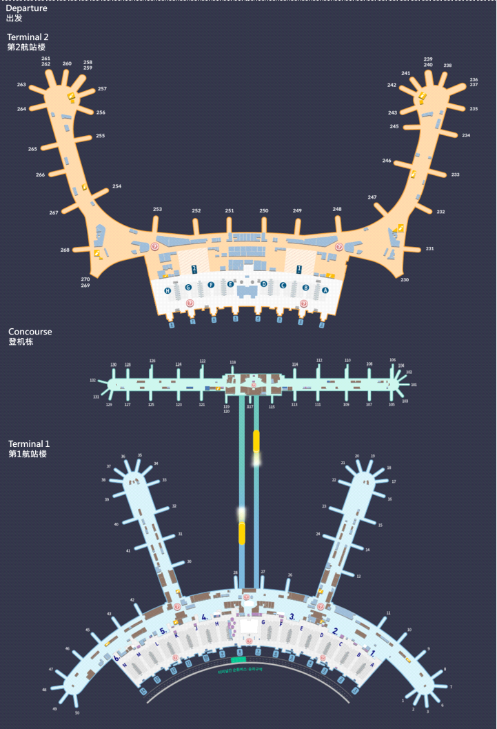 T1国际出发登机口有3个靠桥登机口,1个远机位登机口。