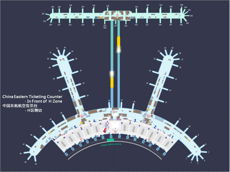 | 高端旅客柜台(头等舱、公务舱、金/银卡) | 候机楼出发厅一楼 | |