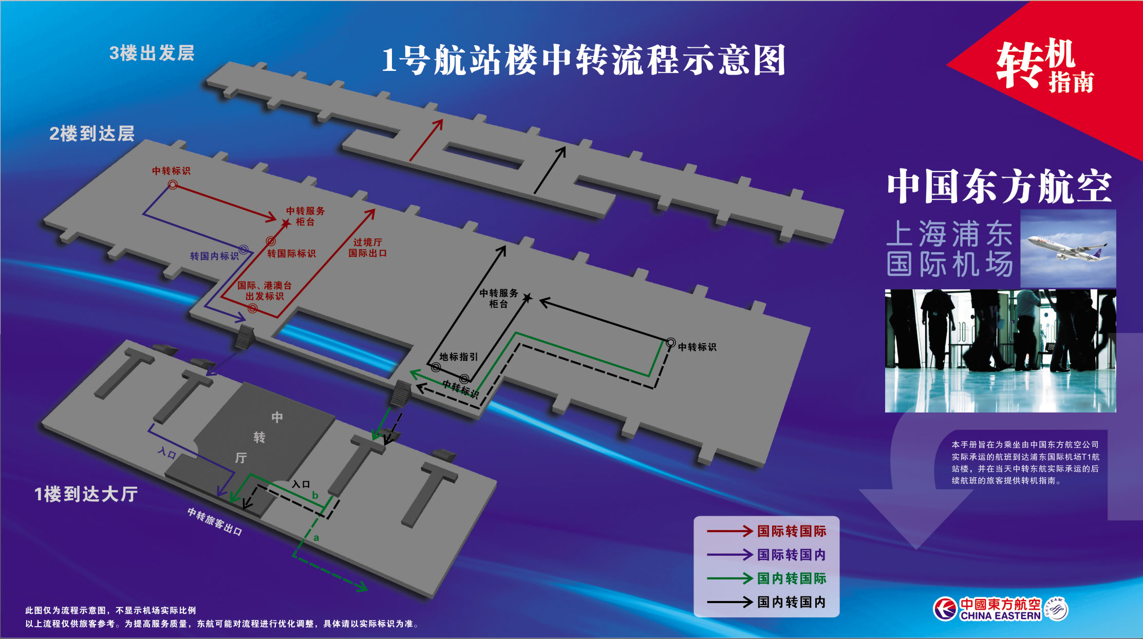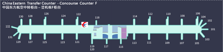 | 出发区域 | 公务舱、白金卡、东方万里行金银卡柜台(国内) | 出发大厅1号综合值机柜台(头等舱金银卡特殊旅客) |