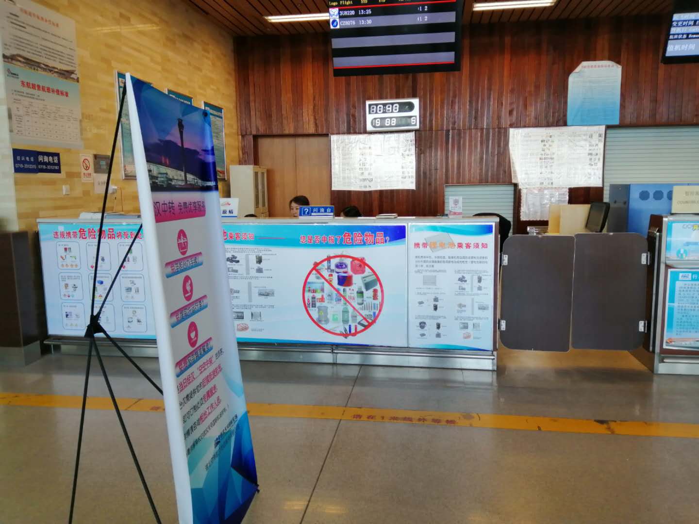 航站楼出发大厅问询柜台行进行李查询服务。